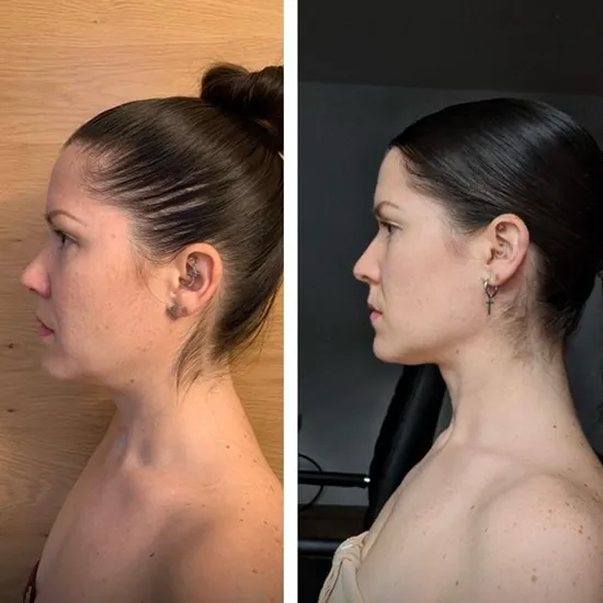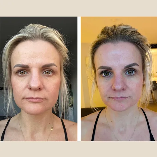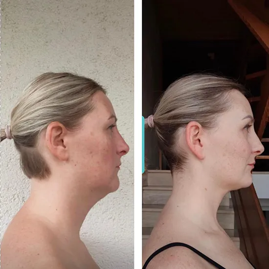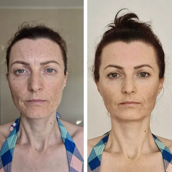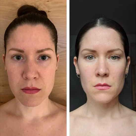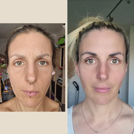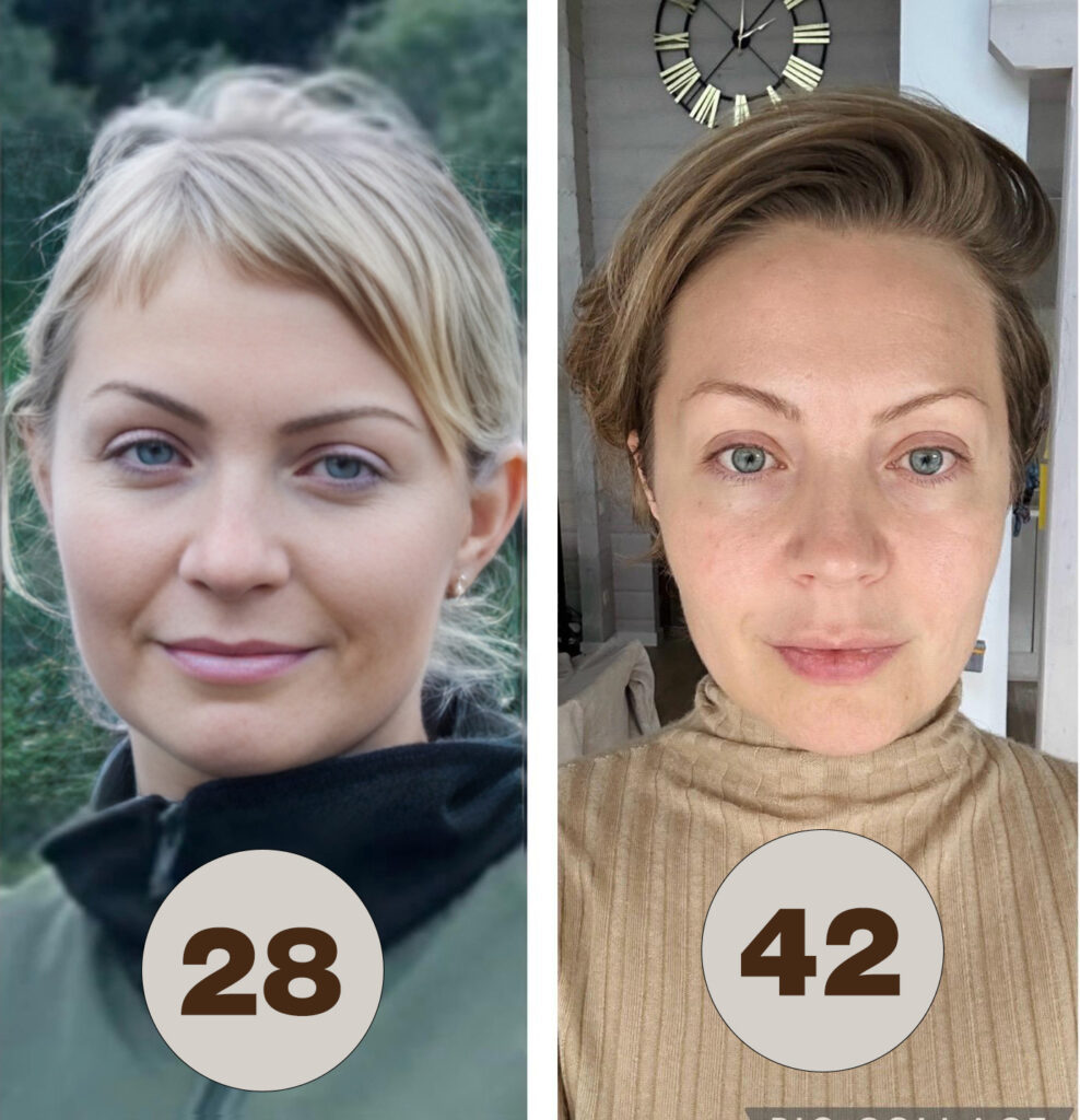 So habe ich mit 28 Jahren ausgesehen: geschwollen, mit ausgeprägten Nasolabialfalten, Augenringen und dem sichtbaren Altersdreieck im Gesicht.
